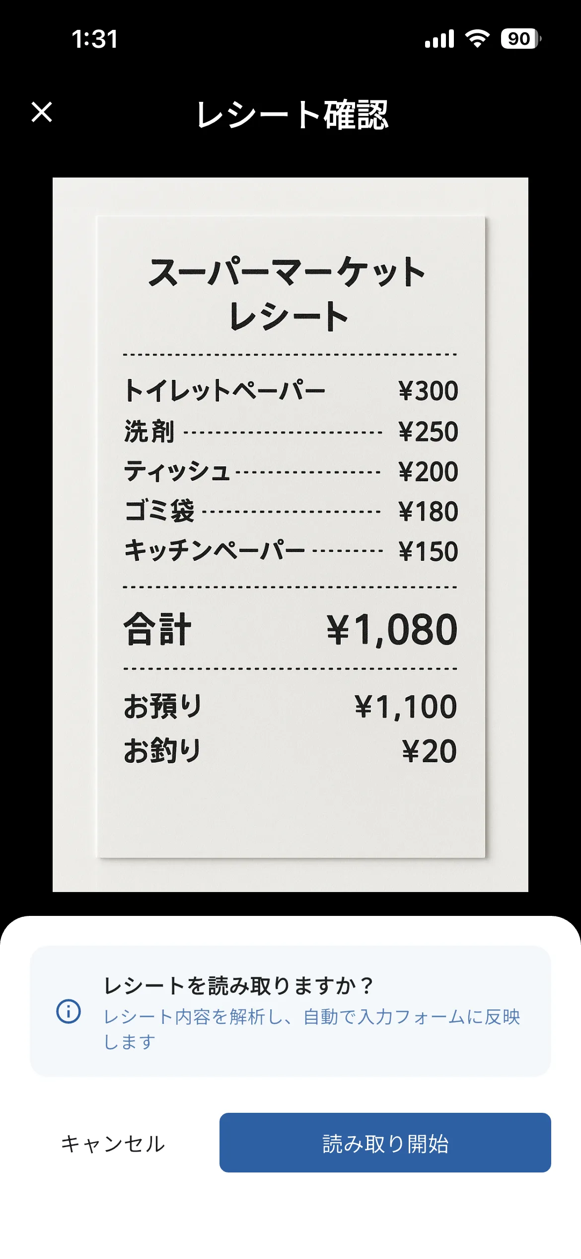 - 専用スマホアプリでレシートを撮影すると取引内容を出納帳に自動反映します。